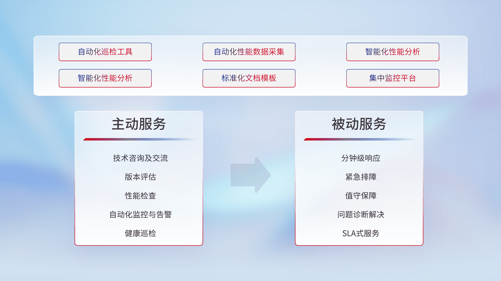 智能化工具和标准化文档,,,,保障服务质量,,提供主动服务(包含技术咨询、、、、版本评估、、、性能检查、、、、自动化监控与告警、、、健康巡检)和被动服务包含(分钟级响应、、、紧急排障、、、、值守保障、、问题诊断解决、、SLA服务)。。